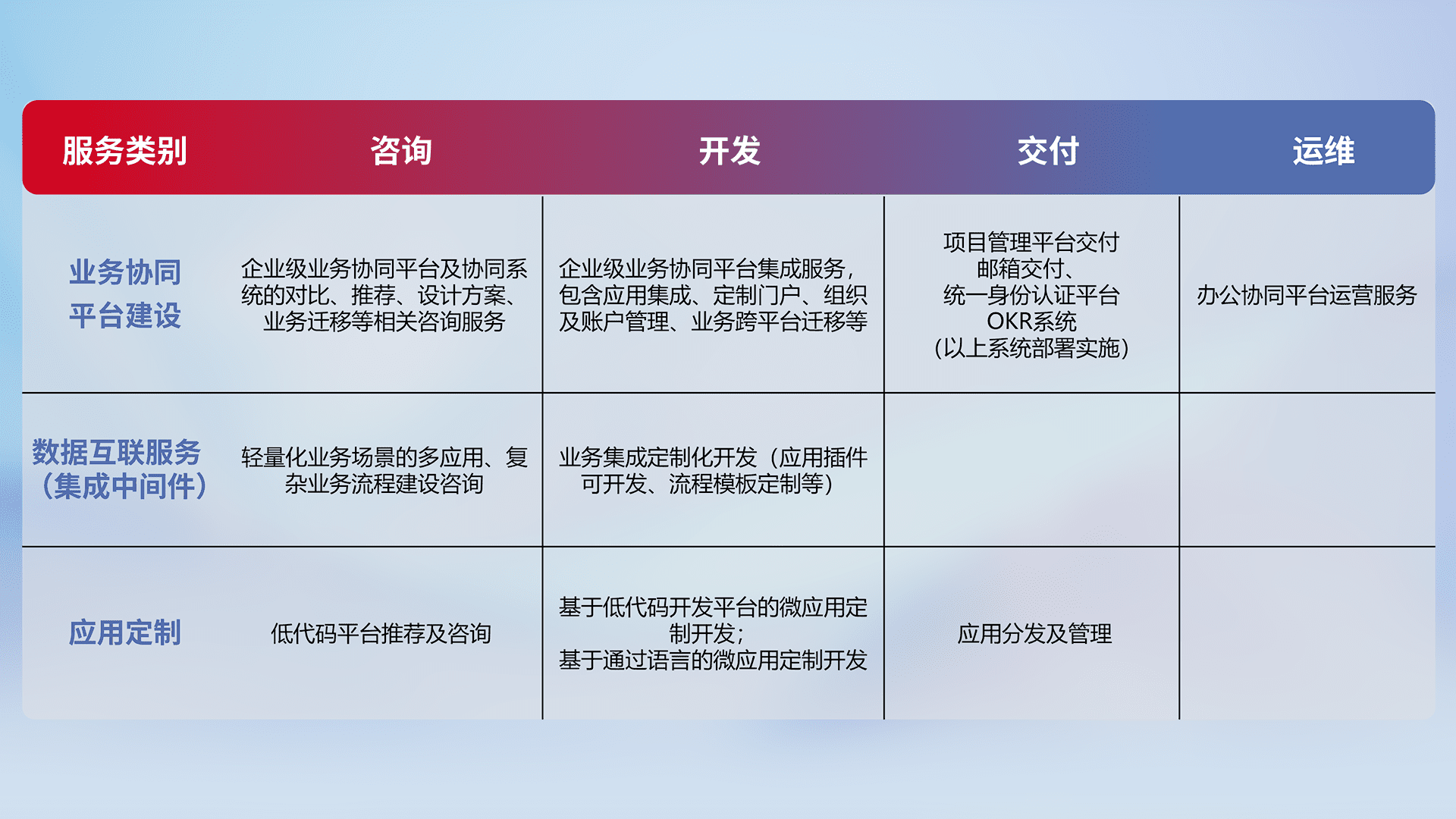 针对钉钉、、、企微、、、IDaas等平台级产品提供产品的规划、、、、方案、、、、交付、、定制化开发等服务,,,,实现如统一协同办公、、、、智能客户服务、、混合会议管理、、、、智能数据查询、、、、等业务场景,,实现数字化转型。。